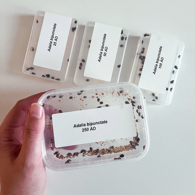 Nos coccinelles adultes Adalia bipunctata sont expédiées prêtes à l'action. Choisissez le format adapté à votre surface à traiter.